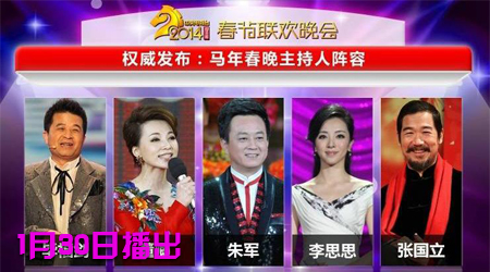 央视马年春晚首次由非央视人员冯小刚挂帅,整场晚会分为“春夏秋冬”四个主题,邀请到成龙、那英、冯巩、林志炫、李玟、刘欢、孙楠、庾澄庆、李敏镐、华晨宇、张明敏、黄渤等加盟。
