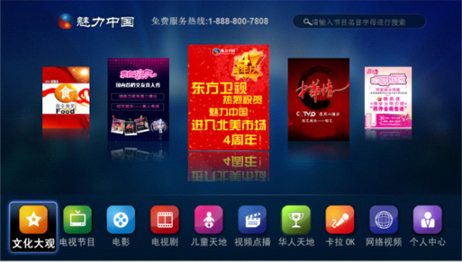 “魅力中国 中文电视”于2008年5月开始运营,是全球最先进的IPTV播放平台。“魅力中国 中文电视”集互联网、多媒体、通讯等多种技术于一体,向家庭用户提供一站式的新闻资讯、文化、娱乐互动服务。用户只需将机顶盒连接到电视机,通过遥控器的选择与确认便可收看精彩的电视节目,获得优质电视服务。节目播放采取先进的流媒体技术,充分利用宽带资源,确保画面质量达到最佳效果。应用全球先进的互联网分发技术,可以实现大范围的快速覆盖,凡是有宽带网的用户就能收看到“魅力中国”的电视节目。